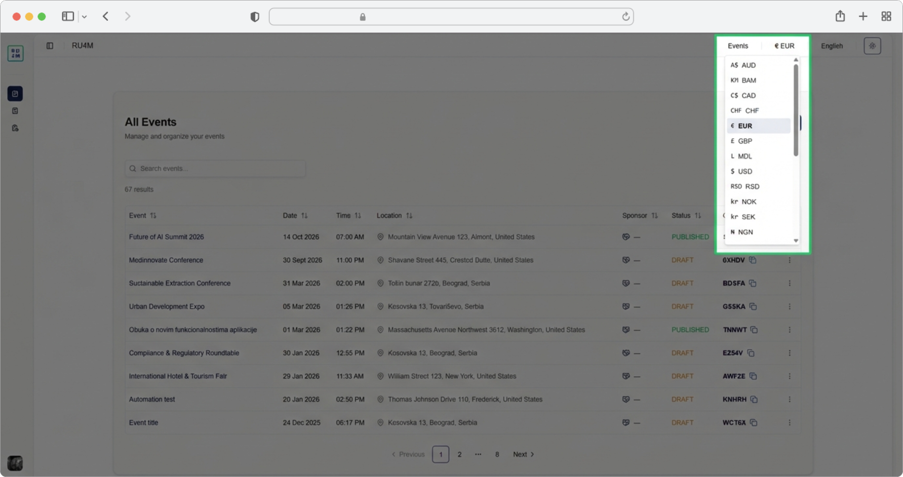 Before you start creating your event, it is advisable to select the currency in which you will make the payment. To access this setting, look at the upper right corner of the screen — you will see a small label showing a pre-defined currency (for example, "USD" or "EUR").