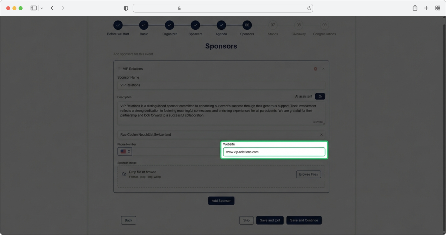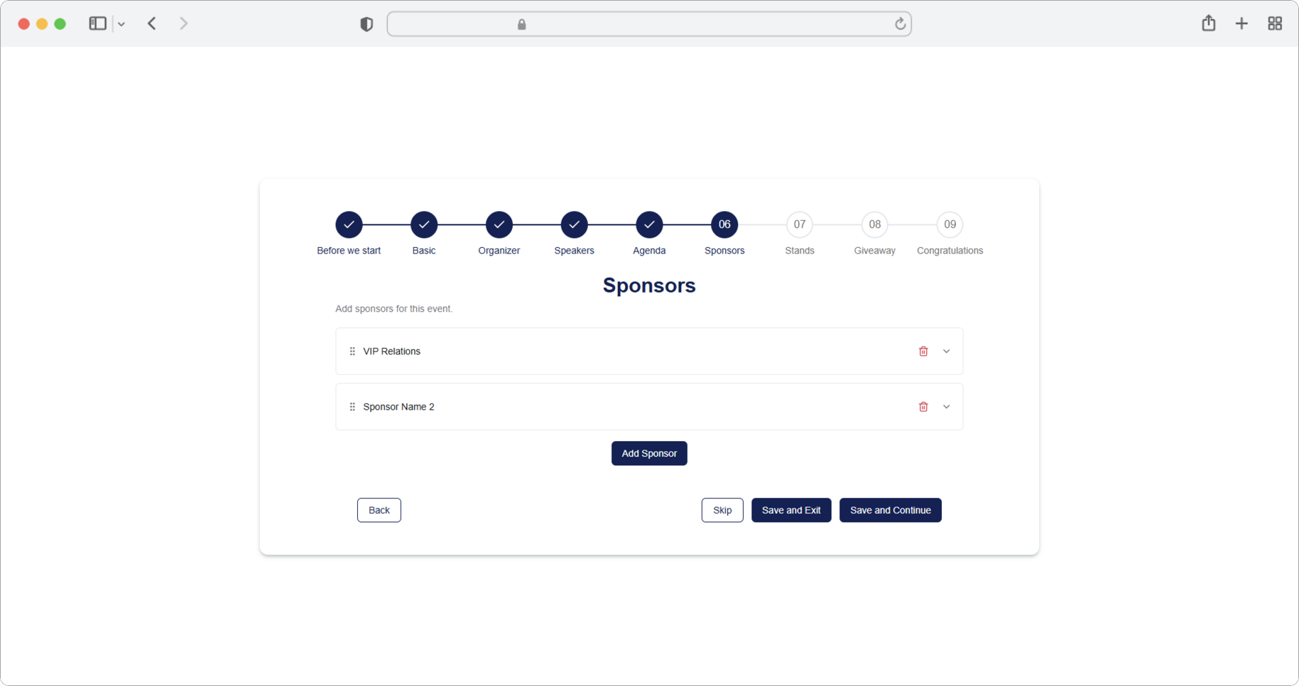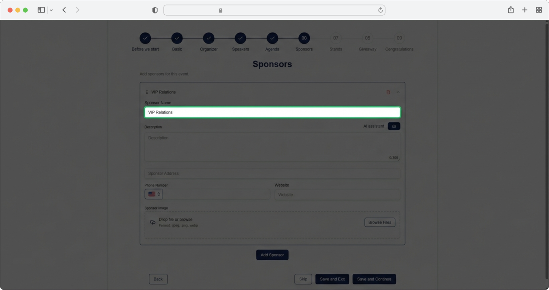 Click the "Add sponsor" button. A form for adding sponsors will open. If you want to skip the step, select the "Skip" option, and if you want to finish creating, select the "Save and Exit" option.