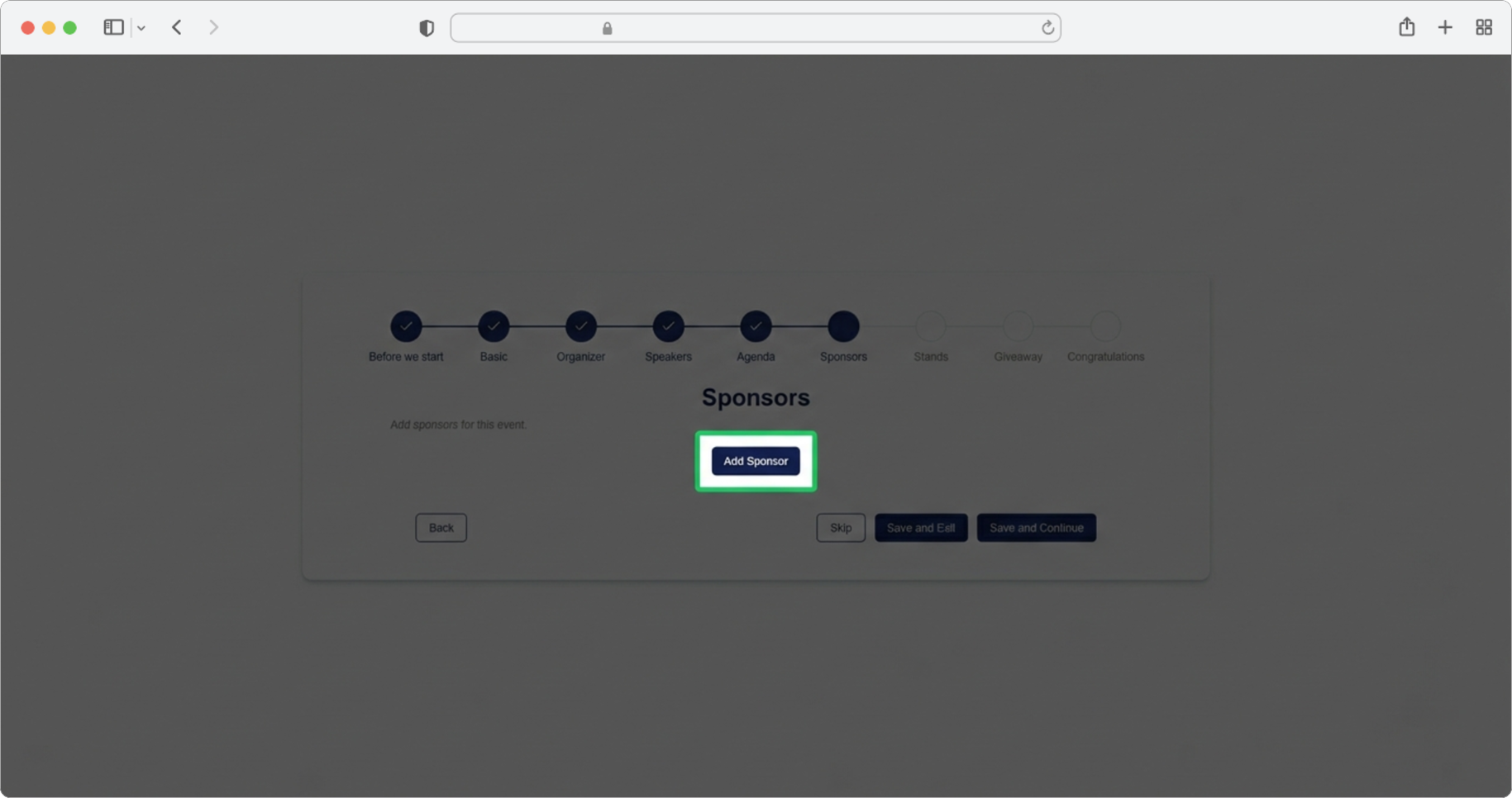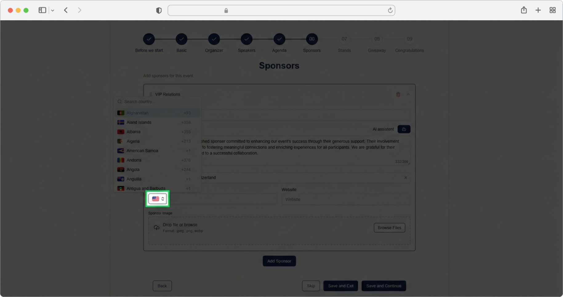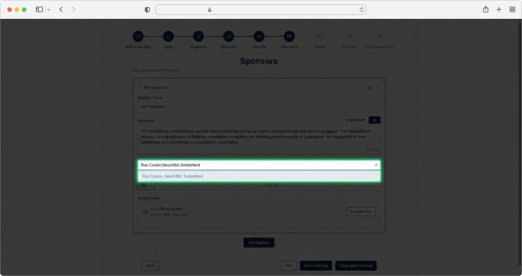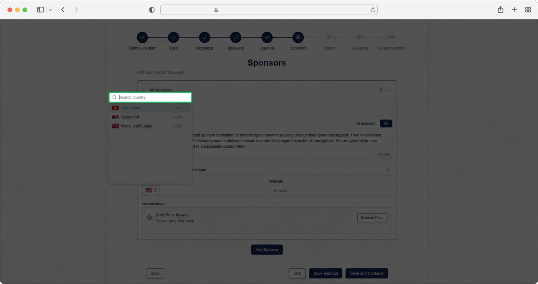 Click the "Add sponsor" button. A form for adding sponsors will open. If you want to skip the step, select the "Skip" option, and if you want to finish creating, select the "Save and Exit" option.