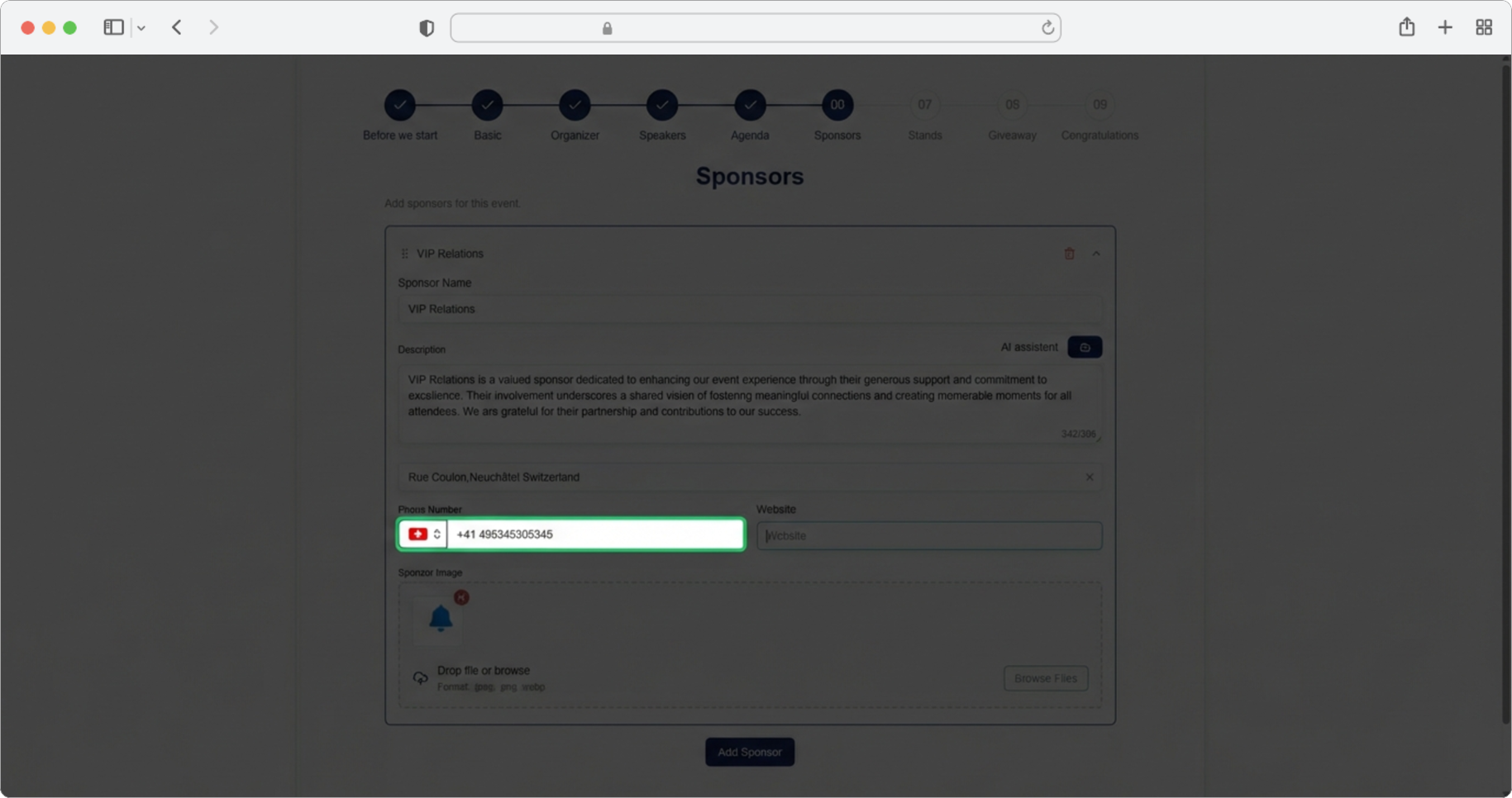 Required field. Click on the text input field labeled "Sponsor Description" and enter a short description of the sponsor, up to 300 characters. Alternatively, click on the AI assistant icon, which will generate a suggestion for you. You can edit the generated text according to your own needs.