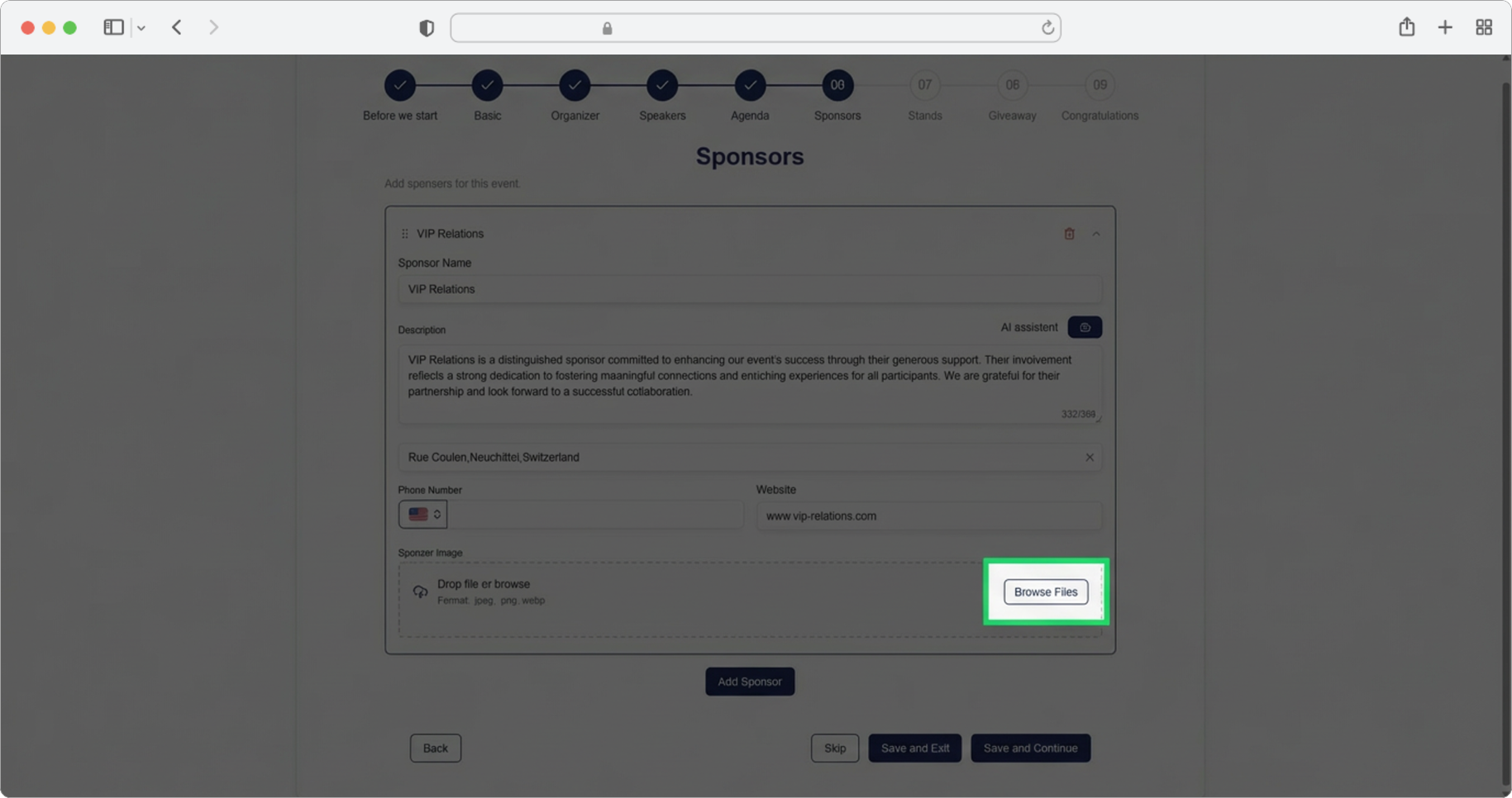 Required field. Add the sponsor's logo. Click the "Browse" button, select the photo from your computer, and after selecting the photo, click "Add Sponsor" again if you have more sponsors, or "Save and Continue" to proceed to the next step.
