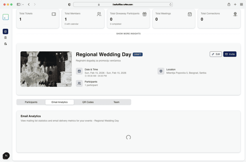 Track your event's performance with charts and engagement statistics. Monitor registrations, attendance, and participant activity.
