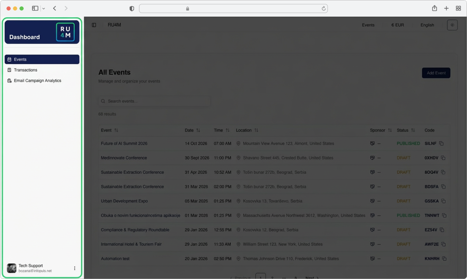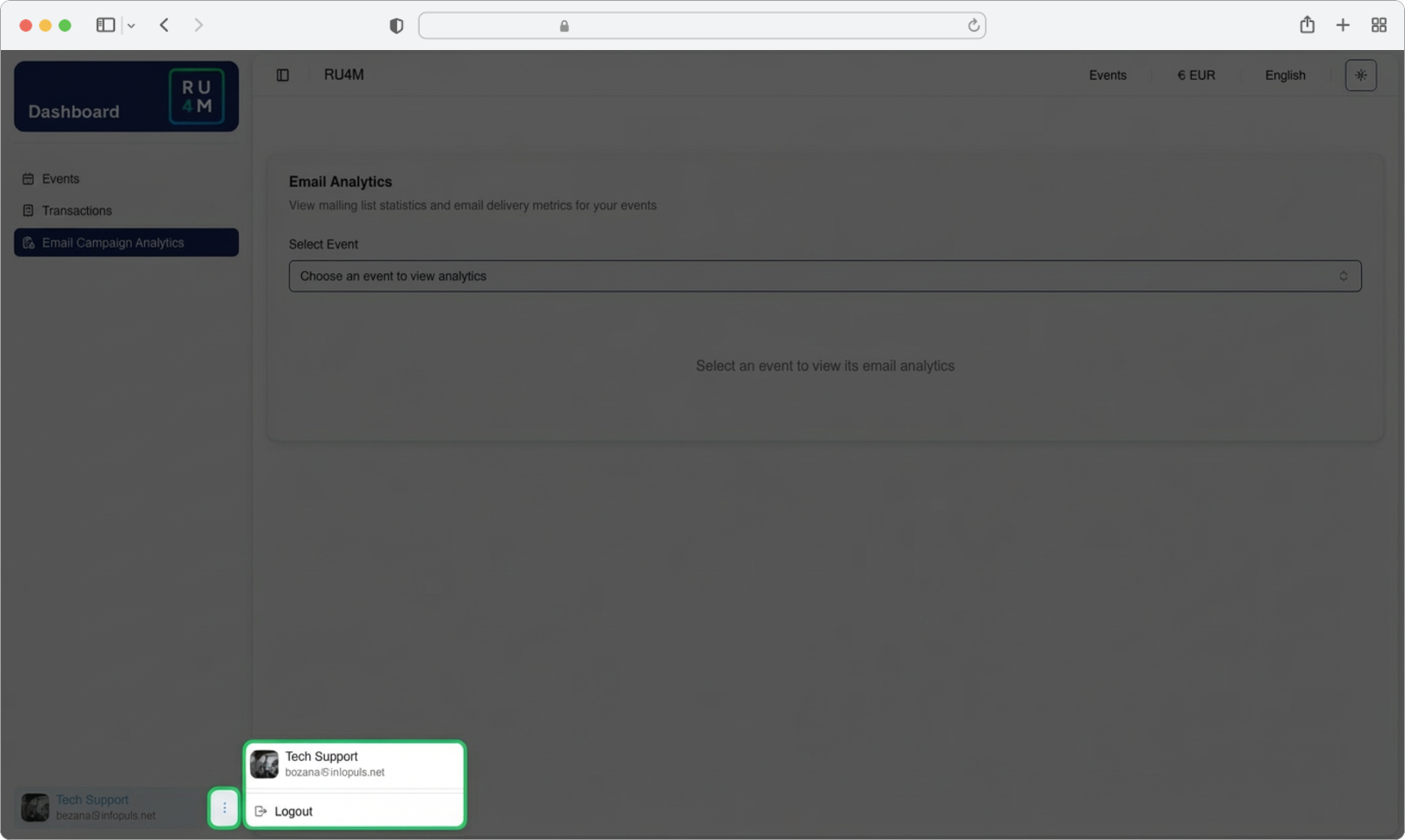 The Dashboard sidebar (the dark panel on the left side of the screen) is your main way of navigating between different features of the RU4M Backoffice. From here, you can quickly switch between managing your events, viewing payment transactions, and checking email campaign analytics. This page explains each option available in the sidebar and how to use it.