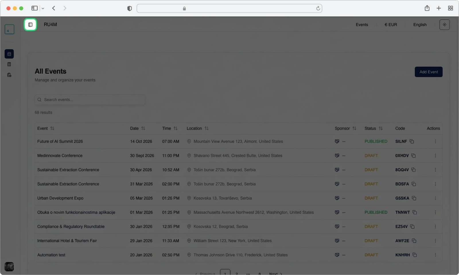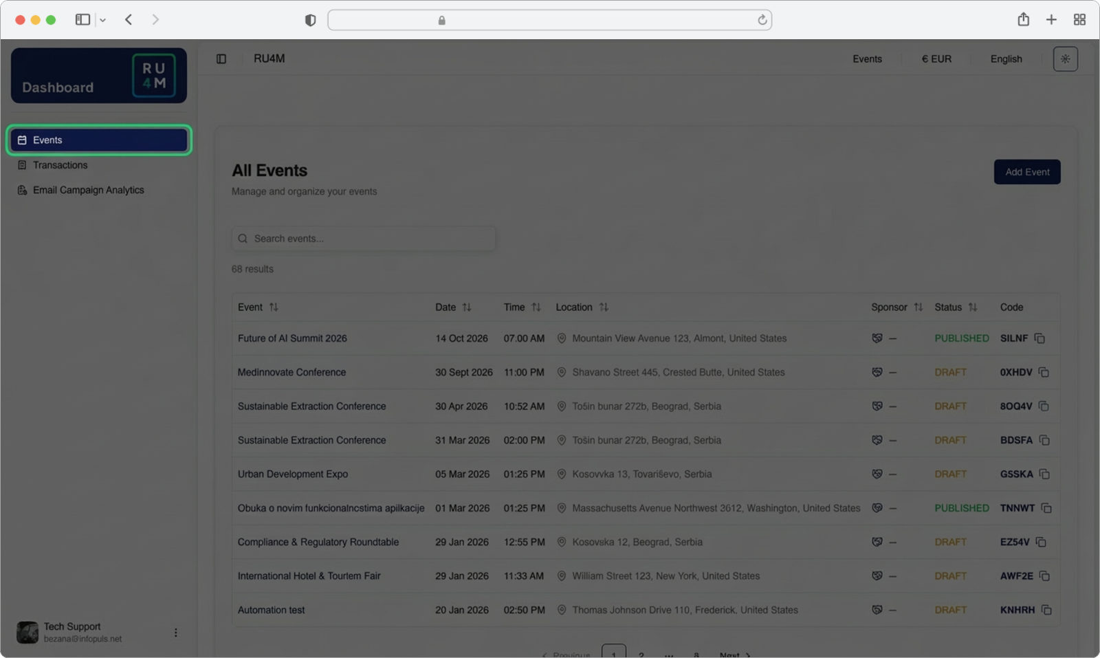The events are displayed in a table format, showing important details for each event such as the event name, date, time, location, sponsor, status (Published or Draft), and an invite code. You can sort the events by clicking on any column header.