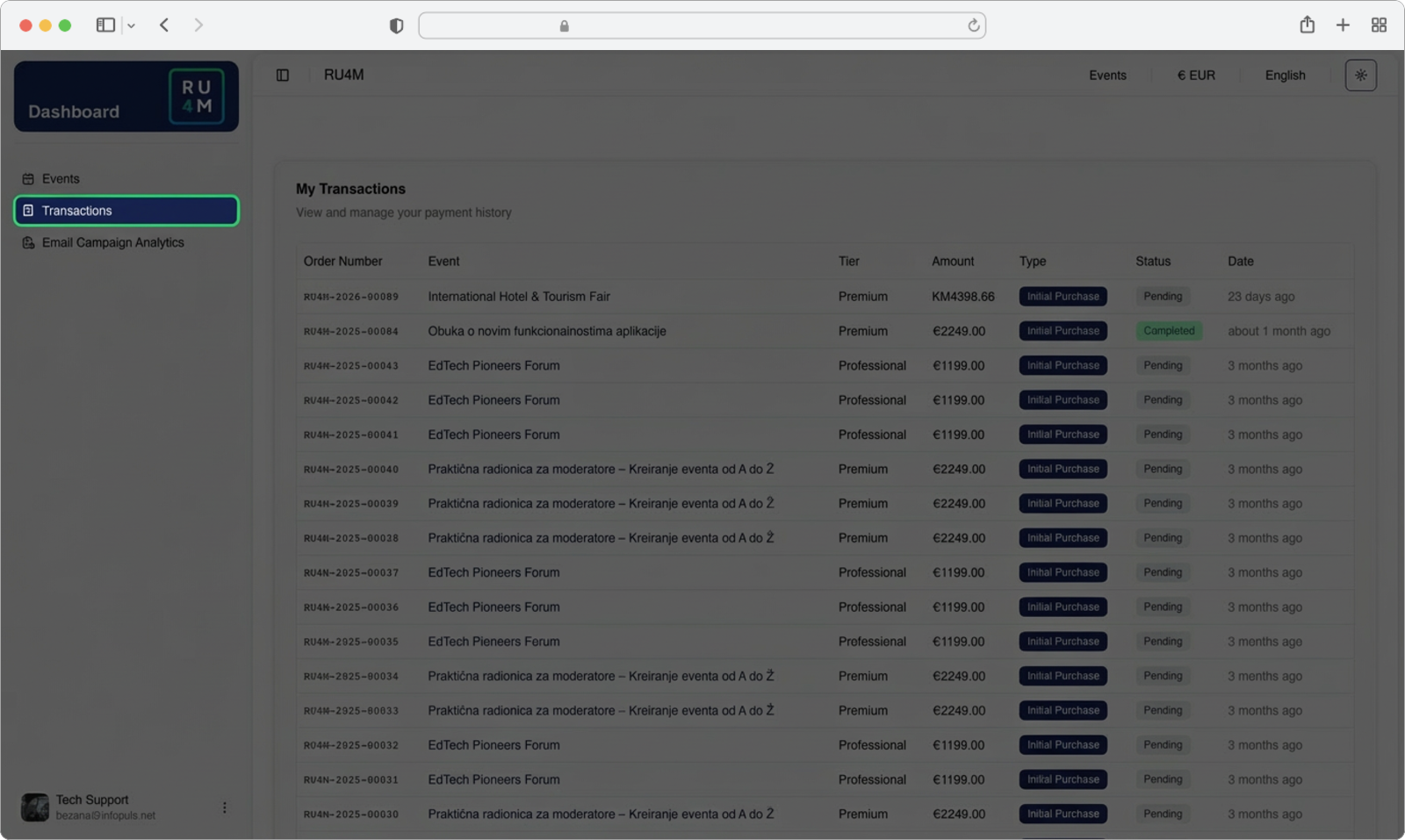 Each transaction is identified by a unique order number and shows the following information: the event name, the selected payment tier (such as Premium or Professional), the purchase amount in euros or your local currency, and the transaction type. Each entry also includes a status indicator — either "Pending" (payment is being processed) or "Completed" (payment has been successfully received) — along with a timestamp showing when the transaction occurred.