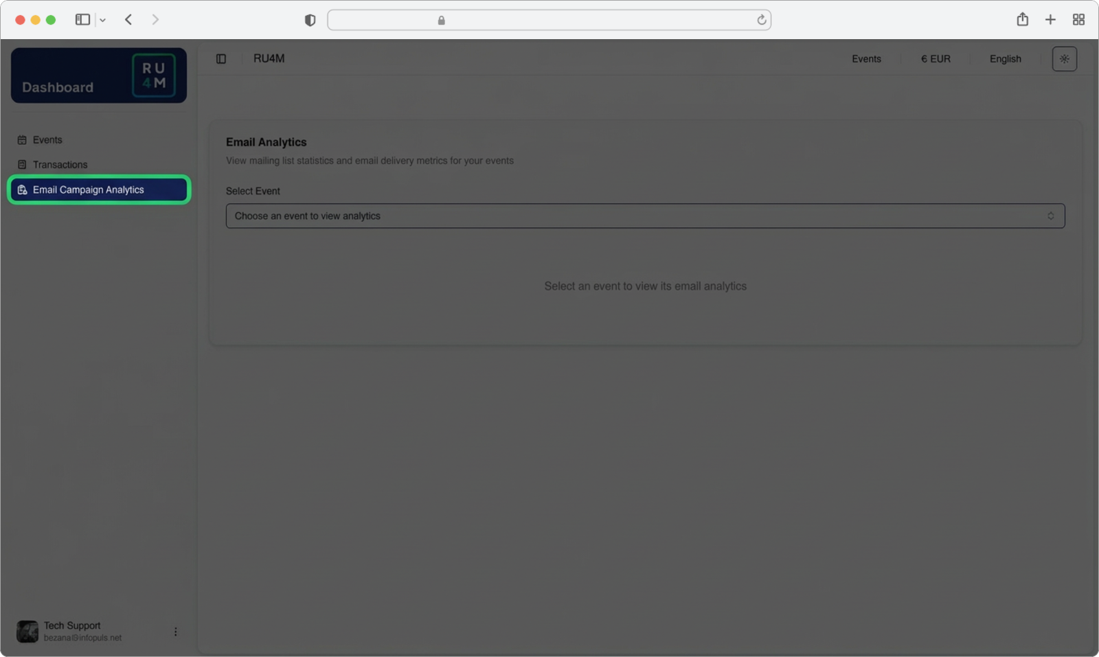 The Email Campaign Analytics page first asks you to select an event. Once you choose an event from the dropdown, the full analytics dashboard will appear with all campaign performance data.