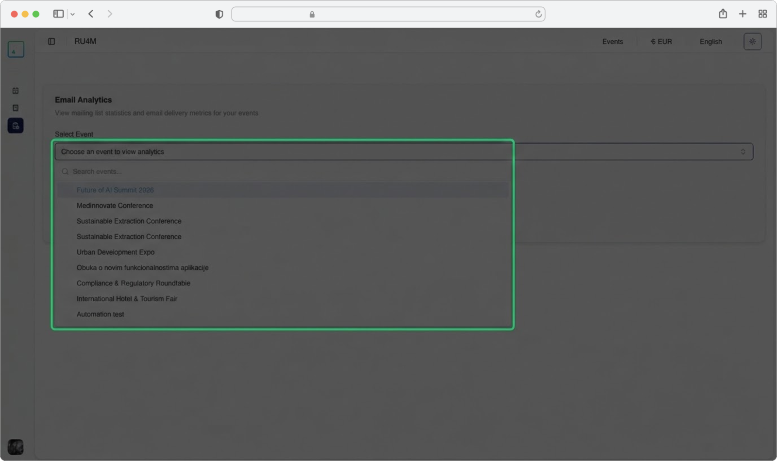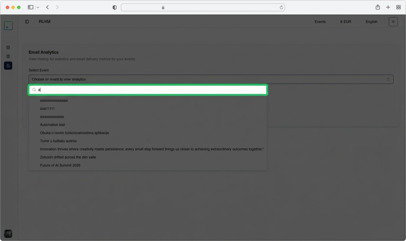 If you have many events, you can type in the search field at the top of the dropdown to filter the list. Start typing the name of the event whose analytics you want to see. The list will update in real time as you type.