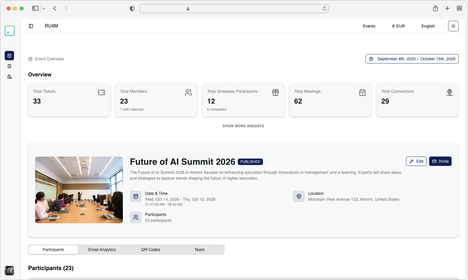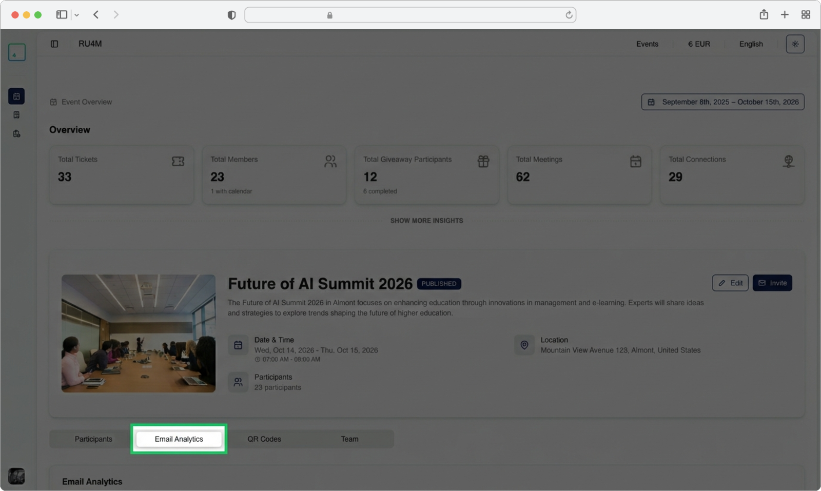 On the event details page, you will see several tabs across the top of the content area (such as "Overview", "Participants", "Email Analytics", "QR Codes", "Teams").