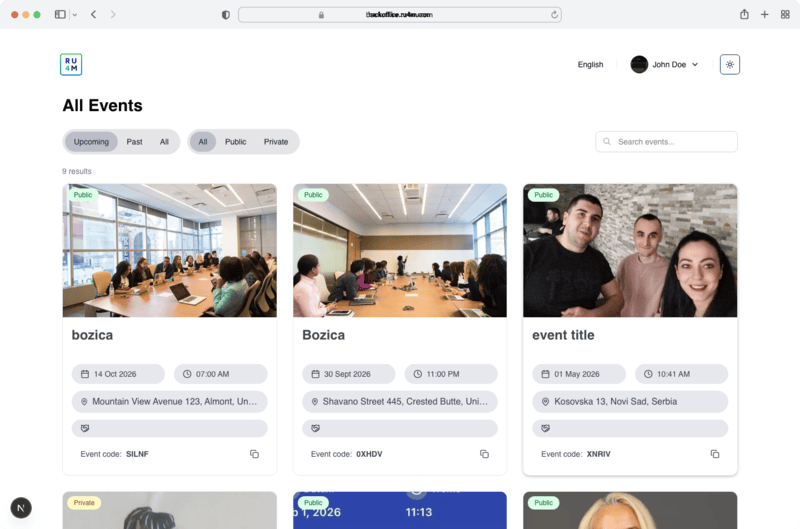 Navigate to the Events section from the main navigation. The page shows a grid of event cards with key information at a glance.