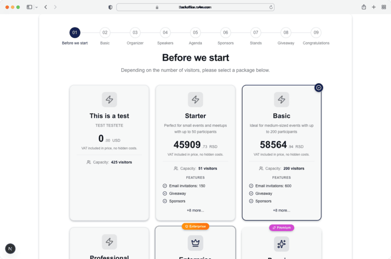 The event creation wizard guides you through an 8-step process to set up a professional networking event. You can also return to edit any step after creation.