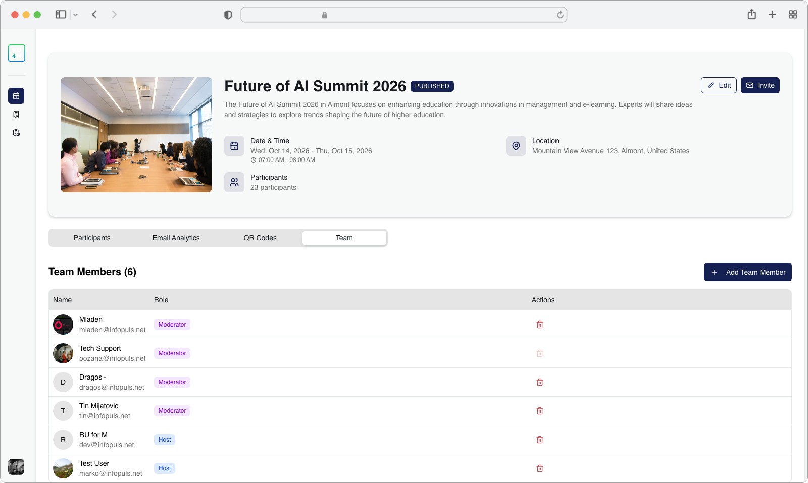 The Teams tab lets you manage the staff and volunteers who help run your event. Here you can see who is on your event team, what role each person has, and add new team members.