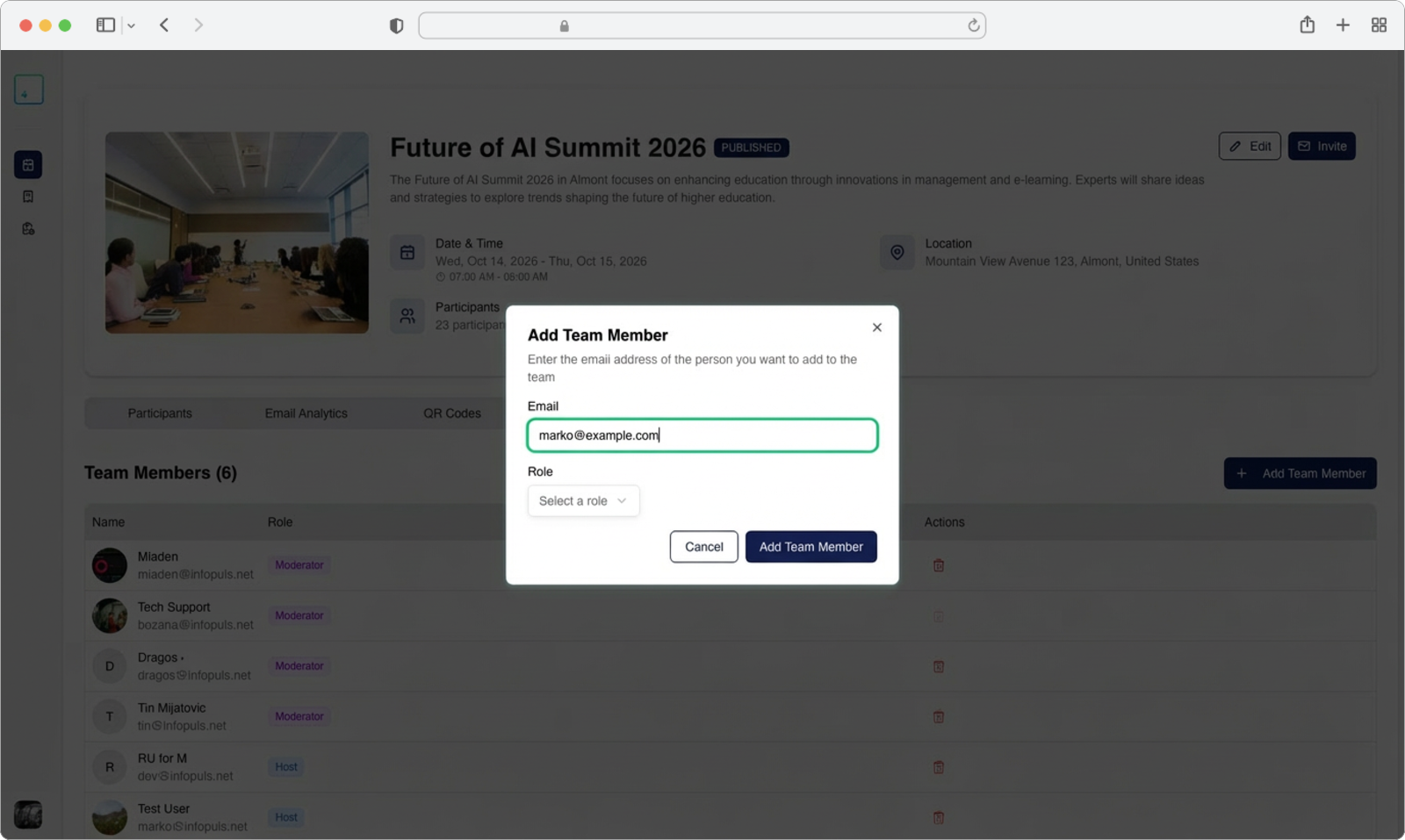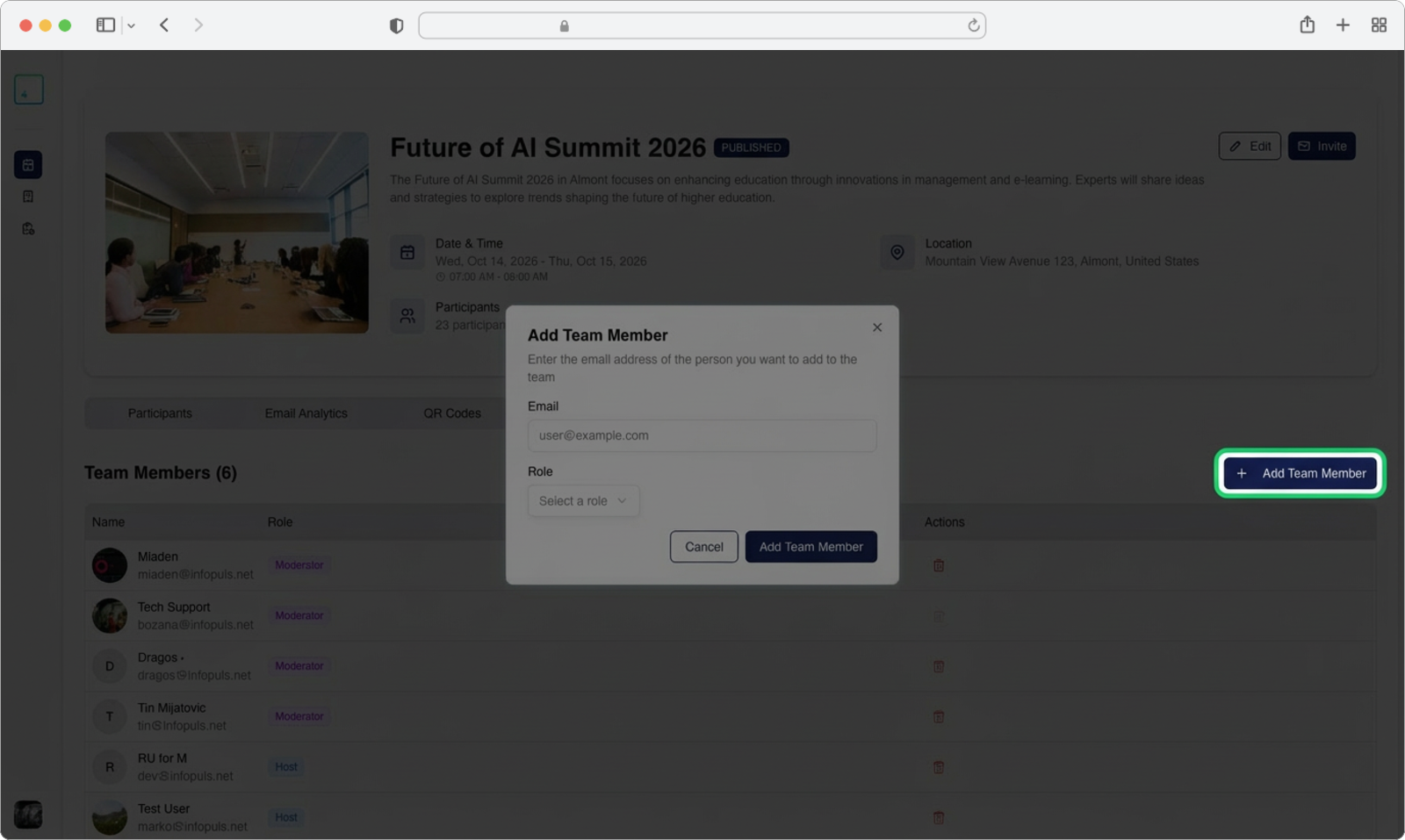After clicking "Add Team Member," the modal will close and you will see the new person appear in the team members list with their name, email, and assigned role.