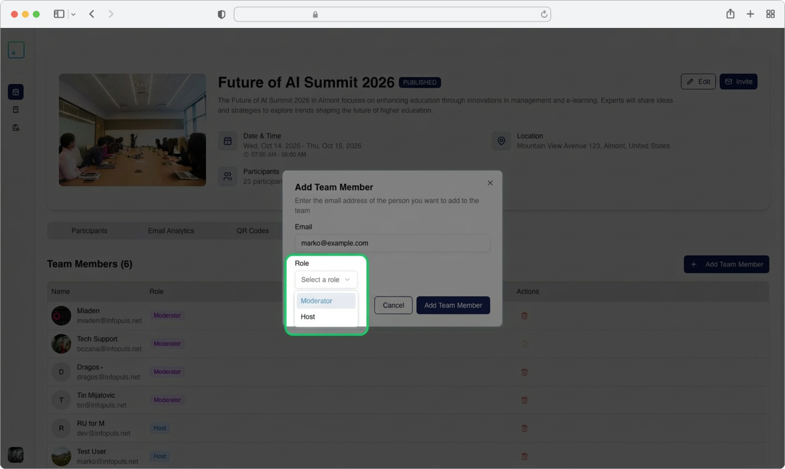 Browse the list and click on the role you want to assign to this person. The role determines what permissions and access the team member will have for this event.
