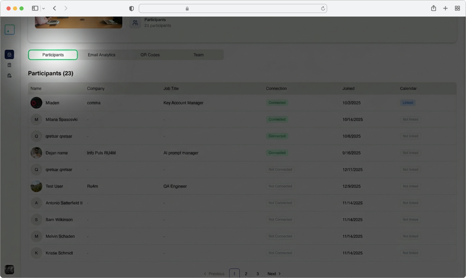 - Calendar link status (status povezivanja kalendara) — Da li je učesnik sinhronizovao svoj kalendar sa aplikacijom (ovo pomaže pri zakazivanju sastanaka tokom događaja)