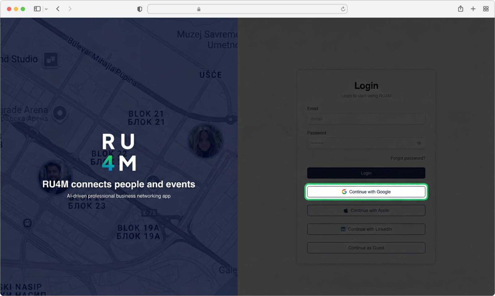 Ako imate Google nalog (Gmail), možete ga koristiti za prijavu na RU4M. Ovo je brz i jednostavan način. Ako još nemate RU4M nalog, prijava putem Googla će automatski kreirati novi nalog za vas.