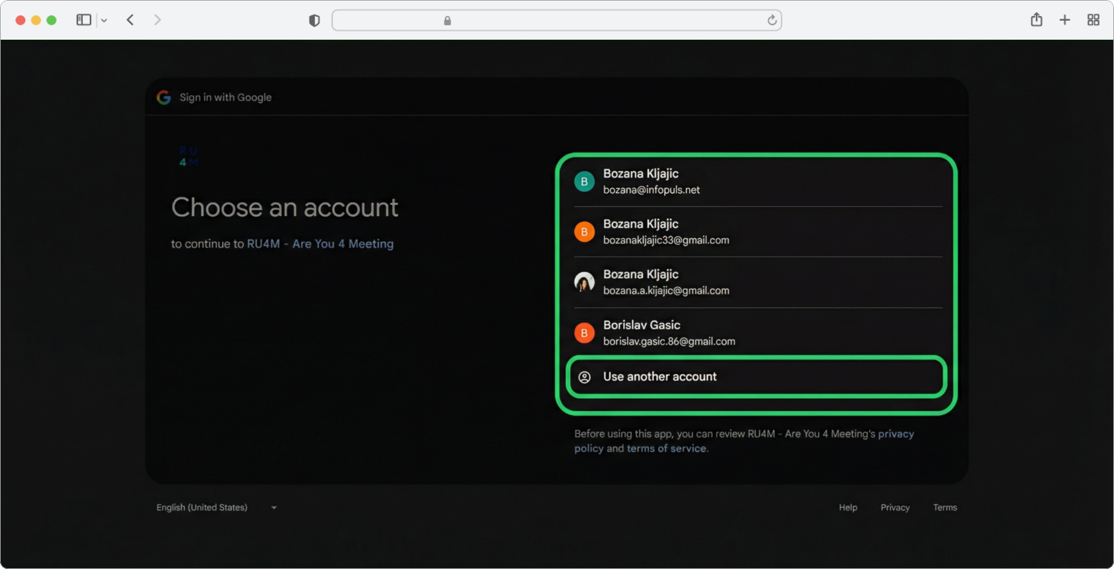 Ako imate više od jednog Google naloga (na primjer, lični i poslovni nalog), obavezno odaberite onaj koji želite povezati sa vašim RU4M profilom. Uvijek se možete odjaviti i prijaviti sa drugim nalogom kasnije.